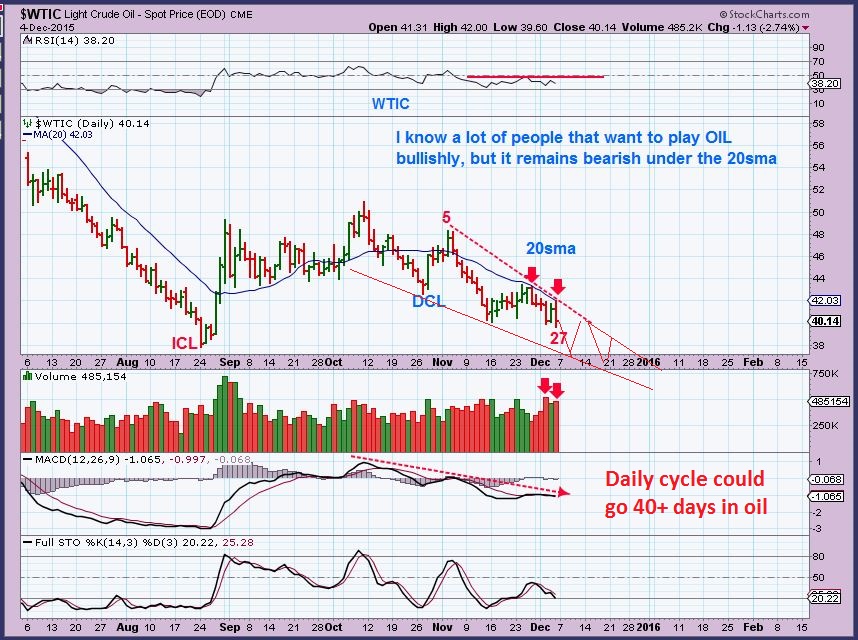 WTIC  Dec 4  Review–  OIL was on DAY 27 –  it still had too many days to go to be bottoming. I drew a possible wedge lower.