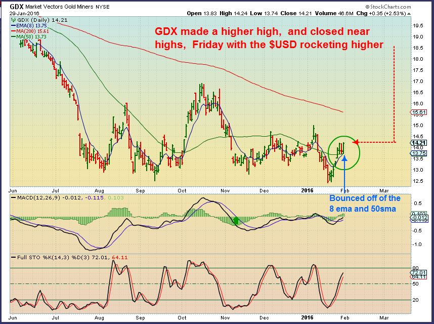 GDX – Made higher highs Friday with the $USD rocketing higher.