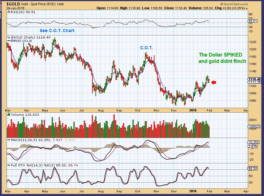 Gold Jan 29 – Gold closed higher when the USD spiked over 1.14. Gold bounced off of the 8 ema too.