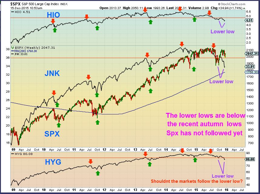In Mid December I had a rather lengthy weekend report , and I showed how the JUNK BONDS / High Yield were leading the way down by making new lows, and I said that I expected the markets to follow. One of the charts I used was this one.