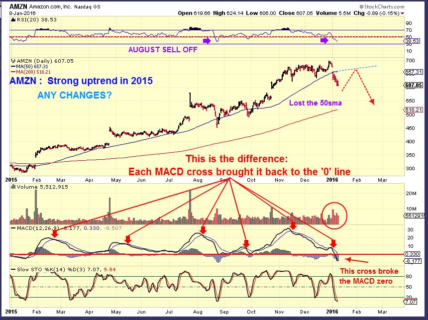 AMZN – I wanted to look at the strongest stocks and see if I could find any ‘changes’. AMZN dipped below the 50sma in the past and recovered ( Will it now?). Also the MACD used to cross down and a normal pull back returned it to the zero line ( Healthy). Now we crossed under & dropped below the zero line. I am interested in looking at these type of things when we get bounce. It is oversold.