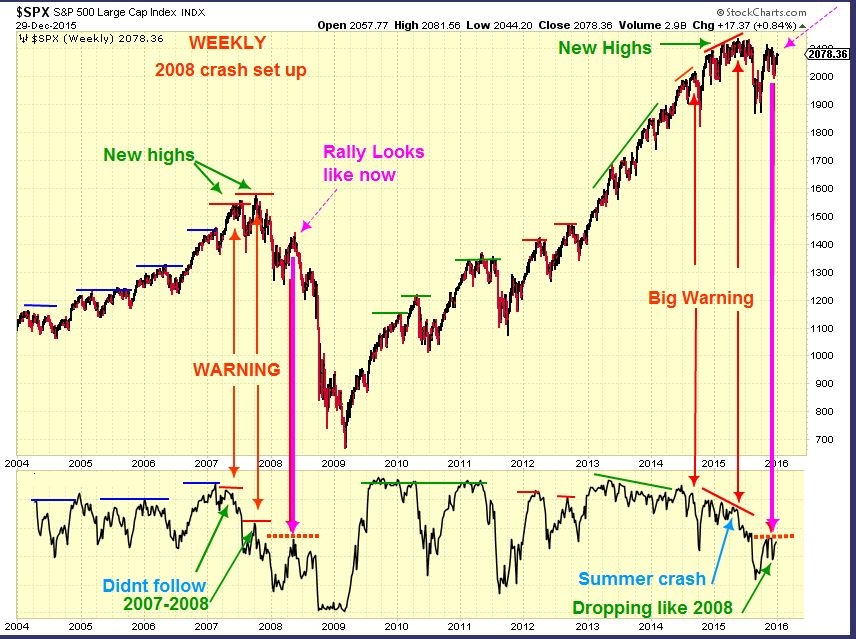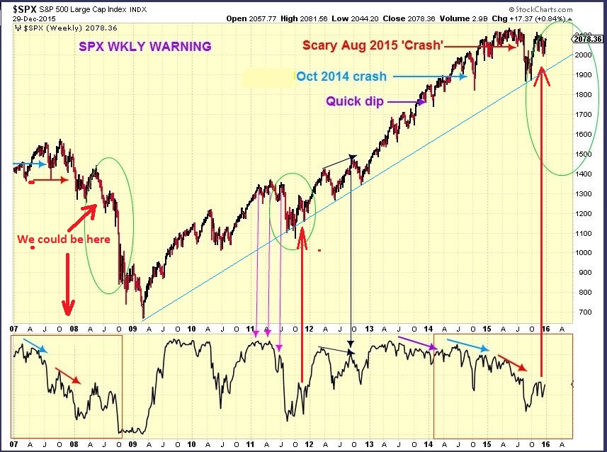 SPX WEEKLY WARNING – A closer look. On Dec 29 I wrote that “we could be here”, it lead to a big drop in 2008. I also Thought that we could be in the 2011 green circle area, less of a drop, if we dont close below the trend line. We just closed just below it Friday. Immediate recovery needed this week or selling can become extended- even panicky.