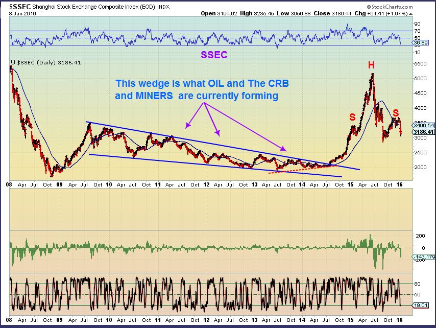 SSEC – a 2 fold chart. I wanted to point out how explosive these wedges can be. On the other hand, we now see a H&S pattern in China.