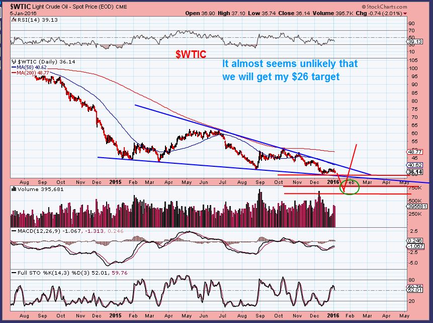 WTIC – OIL could actually be making a low here. My weekly target of $26 area may not play out. Cycle wise the timing is fine, and we have a break down on this wedge. I drew this wedge on the JAN 5 chart to show extreme capitulation to that $26 area, but said that I doubt that would happen.