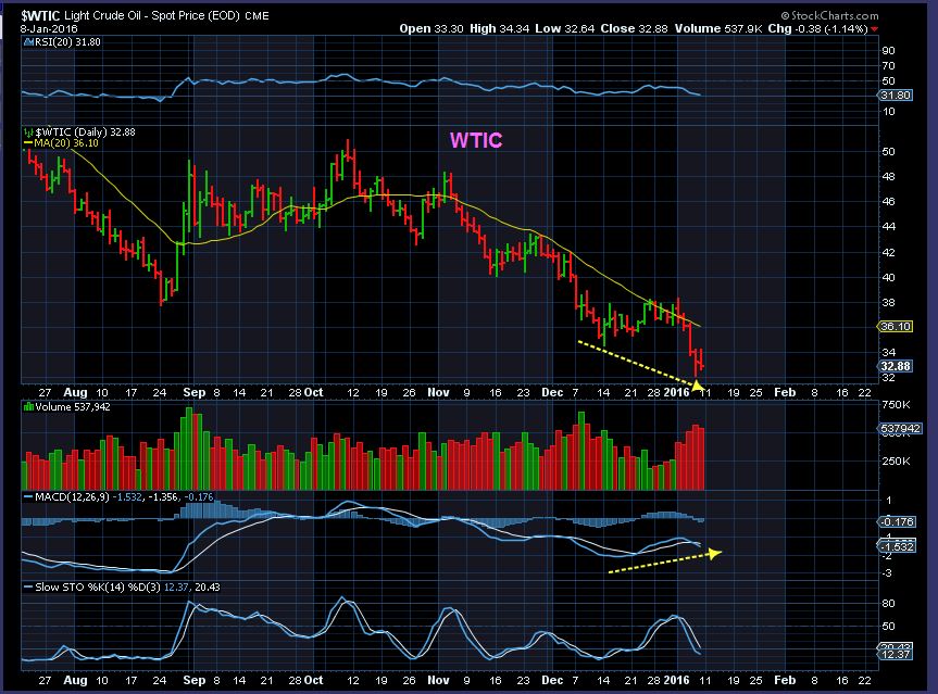 WTIC CLOSE UP – We do see capitulation type volume and divergence, but recall that OIL struggles at the 20sma so far.