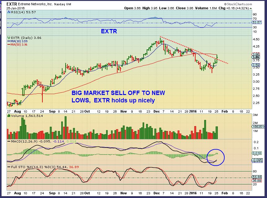 EXTR – Buy above the 50sma with a tight stop or buy here with a stop below the lows. It did NOT crash when the markets fell apart, it should move higher if they Bounce / Rally.