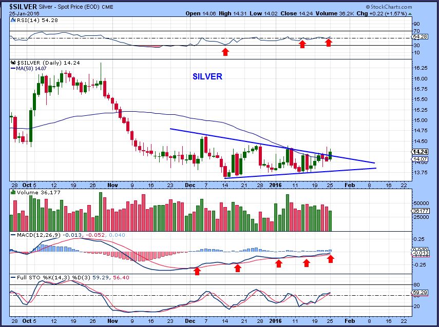 SILVER – Silver is not making tons of progress, but as mentioned in prior reports, it usually bursts higher in the second leg higher. You can see in the Gold chart that Gold based (triangle) and jumped higher. This is when Silver usually joins the move.