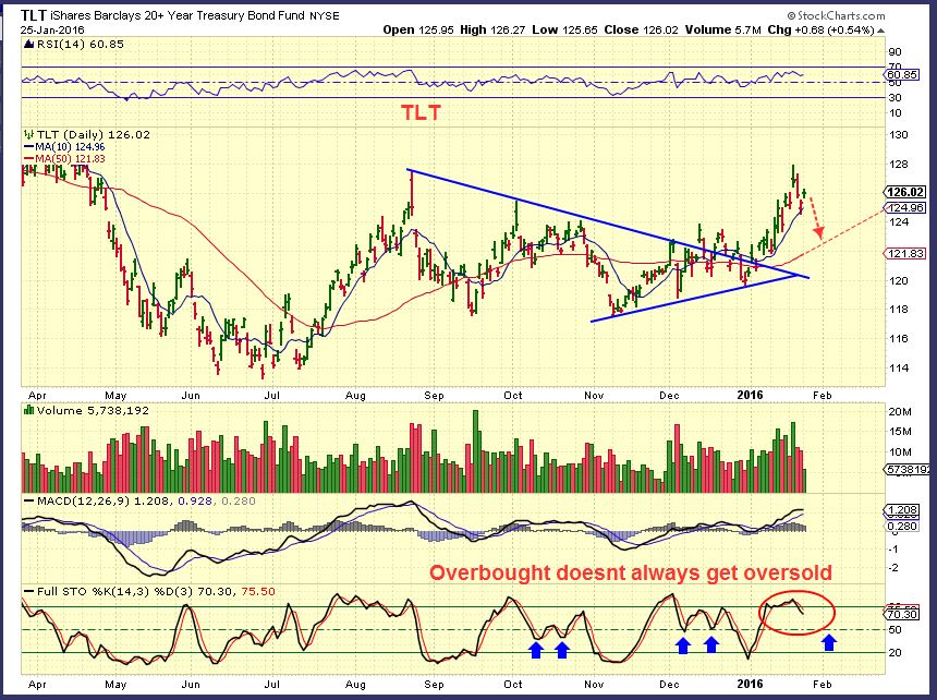TLT DAILY – It is overbought in the stochastics , but often just drops to below the 50% line. I’d watch the 50sma for support if it drops. ( $122-ish)