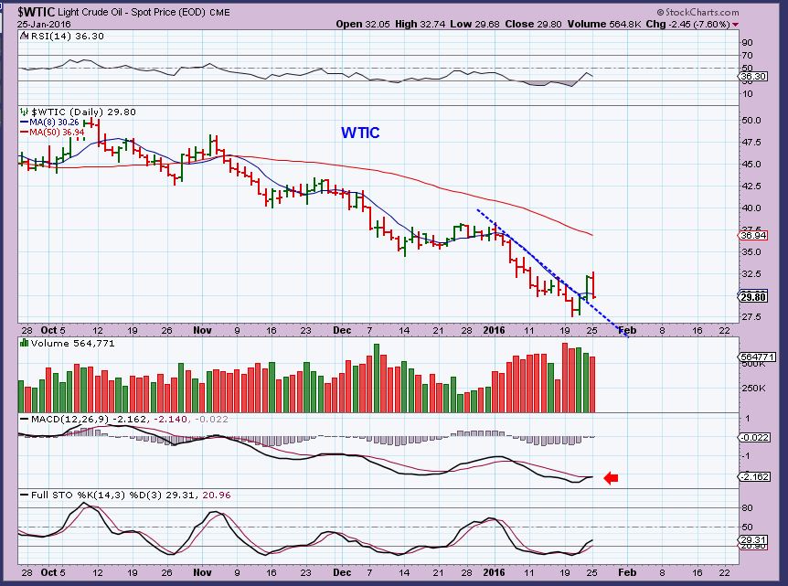 WTIC – So while Oil pulled a strong reversal, Many energy stocks dropped too. Last week energy stocks ran up 30-50% and yesterday some gave back 20% or so. I did mention in last weeks report that “This area is for FAST EXPERIENCED TRADERS that are in front of their screens all day.” Bottoms are a process, and these 20-50% moves in energy stocks can happen in both directions.