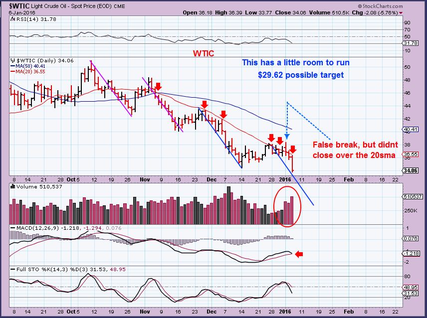 WTIC Wednesday – The false break of the 20sma 2 days ago reversed without follow through, and now there is a possible break down target of $29.62. My weekly chart still has a target of $26 as mentioned in prior reports, but will we go there? Are there any questions about Oil so far?
