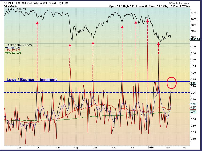 You may recall that I used this CPCE and 2 other charts to call the lows in the past. A high reading (near .90 or greater is when a low should be approaching.