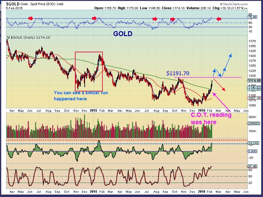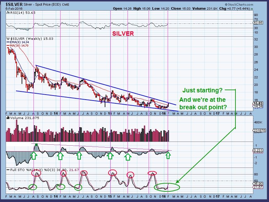 Silver Wkly FEB 5 – You will remember this chart ‘set up’ from the past 2 weeks weekend reports. Amazingly, Silver STILL looks like it is just starting to break out and take off upside. Silver stocks began to run very well last week.