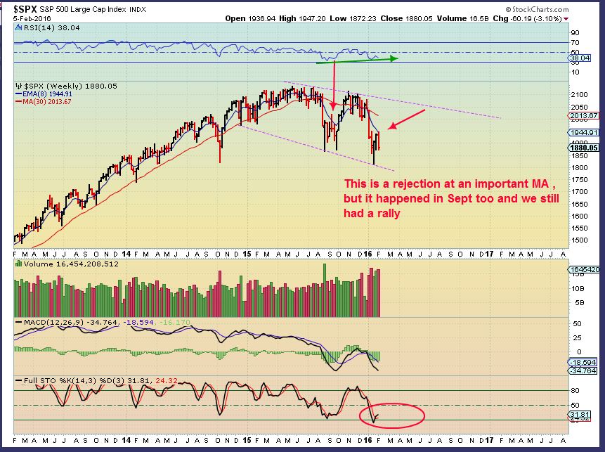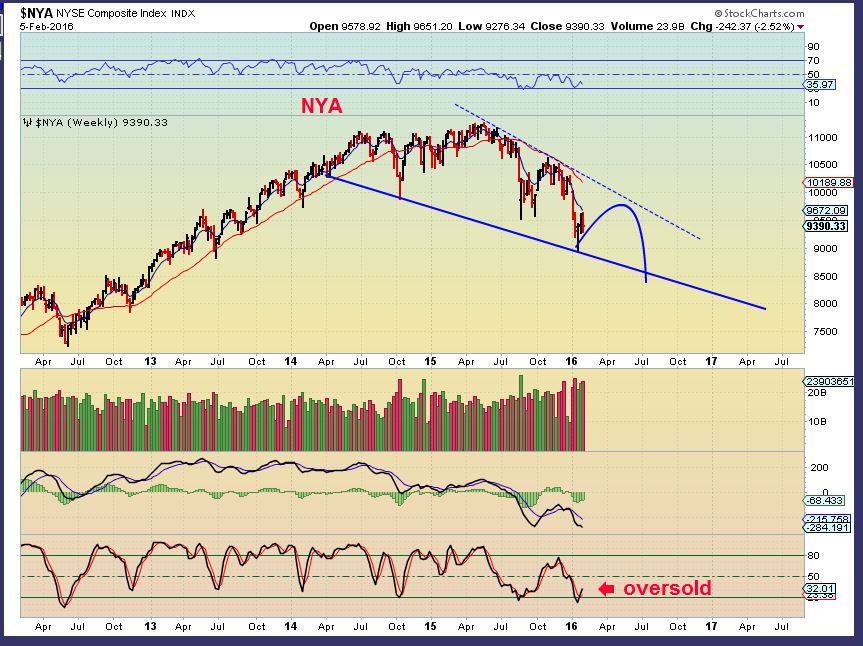 SPX WKLY – We still see trading volatility like last August. Since we broke the August lows, I believe we’ve started a down trend and this will roll over in time. (See past reports). Right now I expect a false rally soon, but the daily chart does look weak. I would be cautious / alert here until we get follow through. No short term trend is established.