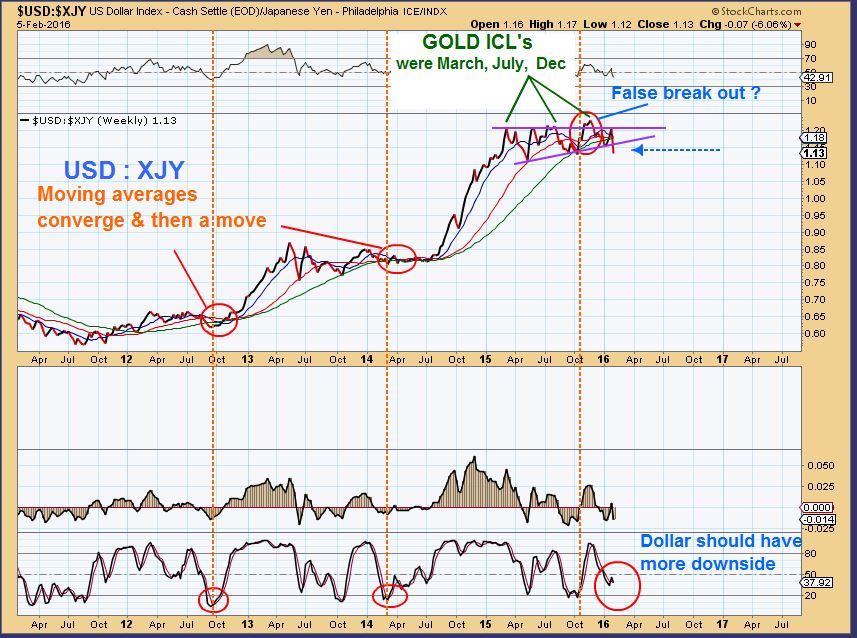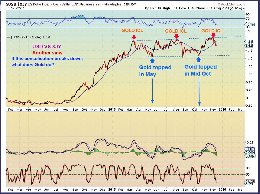 On Dec 11 – I Mentioned that I had been studying the XJY – Japanese yen ( I will share more of those studies later in this report). Here I had pointed out that I was watching the USD VS XJY. When it peaked, we saw GOLD bottom with ICL’s. When Gold topped ( the lower line), This ratio would rally and Gold would drop.