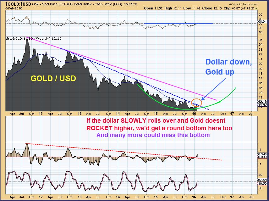 This gradual change in the relationship between GOLD VS USD is also slowly causing a round bottom here too. This bottom would continue with Gold breaking upward and the dollar dropping.