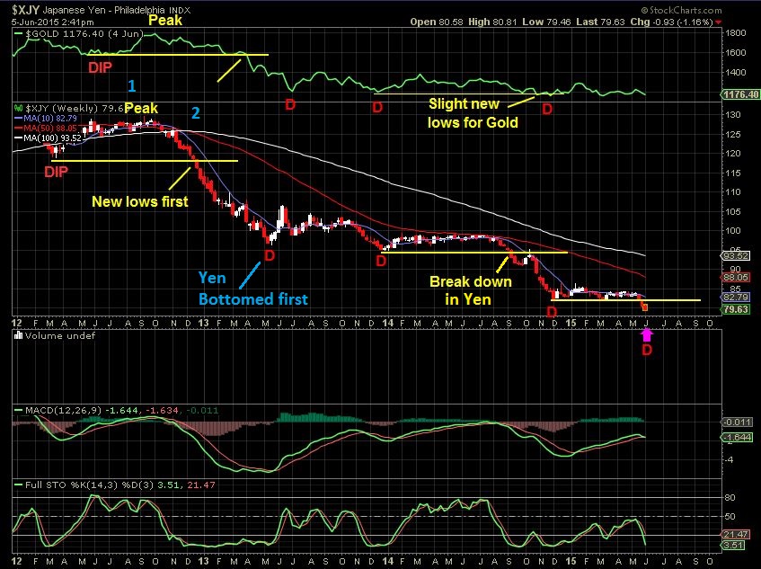 Jan 2012 – June 5 , 2015 – In this chart I placed the XJY in the large box and Gold above. I picked up where the last chart ended. In 2012 the XJY broke to new lows 1st ( 1st yellow line) , and Gold followed later. Each sell off after that saw the Yen bottom near Golds ICL’s. THEN we see XJY broke to new lows before Gold in 2014 again ( 2nd yellow line) , but Gold didnt. Shortly after that- Gold broke down too). That is when I started watching the XJY with GOLD closely.