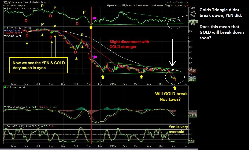 On June 5 – Zooming in. Gold & Yen really acting in sync with dips & peaks. They both formed a triangle. $XJY broke down, would $Gold follow last July to new lows? I expected that low. Read the chart.