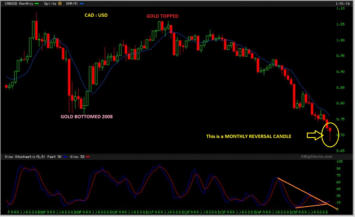 We see a MONTHLY reversal candle. When this happened in 2008 – Gold rallied. When it topped in 2012, Gold topped. ( Click any chart for clarity).