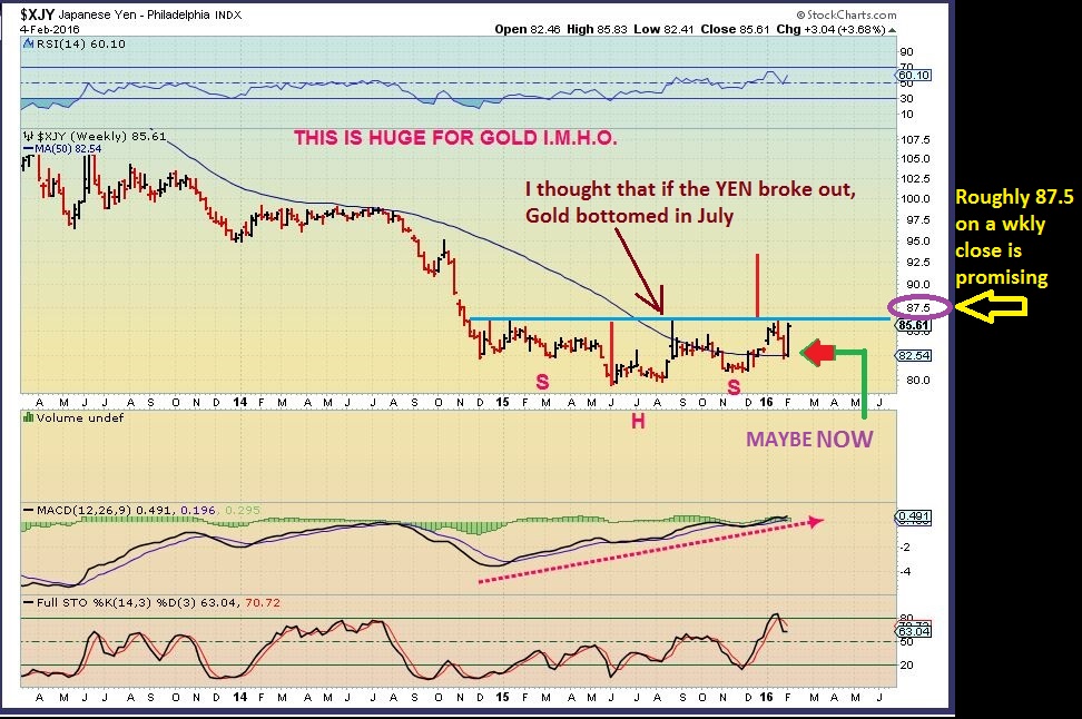 $XJY – After A dip in November heading into the Fed mtg, the XJY ran higher & formed an Inverse H&S. Now in Feb 2016, it looks ready to finally break out. This means that XJY most likely bottom last summer, so I would expect Gold to bottom too. Our SHAKE OUT in the Miners may be THE FINAL LOWS. A break out in the XJY will be viewed as bullish for Gold, I.M.H.O.