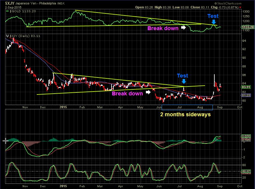 SEPT 2 , 2015 – Gold put in an ICL last July and we traded that low here. I was watching the XJY and it bottomed first in JUNE and made a higher low in August , so I actually started saying, “This could be THE LOWS” from time to time in my reports. I mentioned that I was studying the yen and liked what I saw. This is what I was watching. If the YEN bottomed in June and made higher lows, then I expected Gold to bottom in July & do the same.