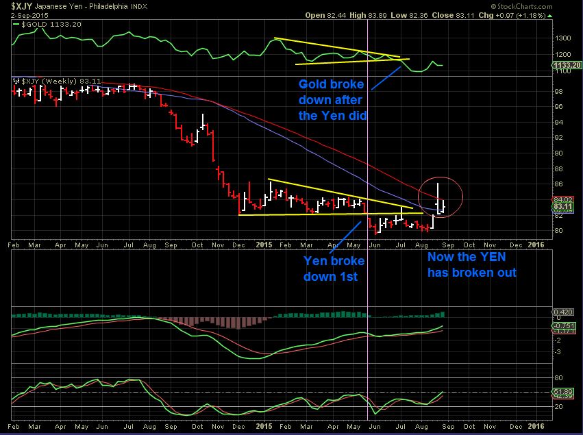 SEPT 2 WKLY – And this was looking good. Notice the break out higher in the yen! Did XJY recover? Would Gold follow?