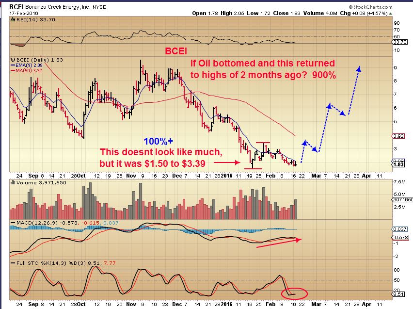 BCEI – This is a double bottom with a higher low. It could be bought with a stop below recent lows. I just want to point out on the first 2 chart the crazy potential with some of these Energy stocks returned to former price .  800-900% from lows to Dec highs.