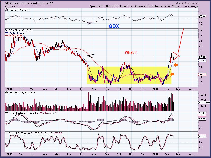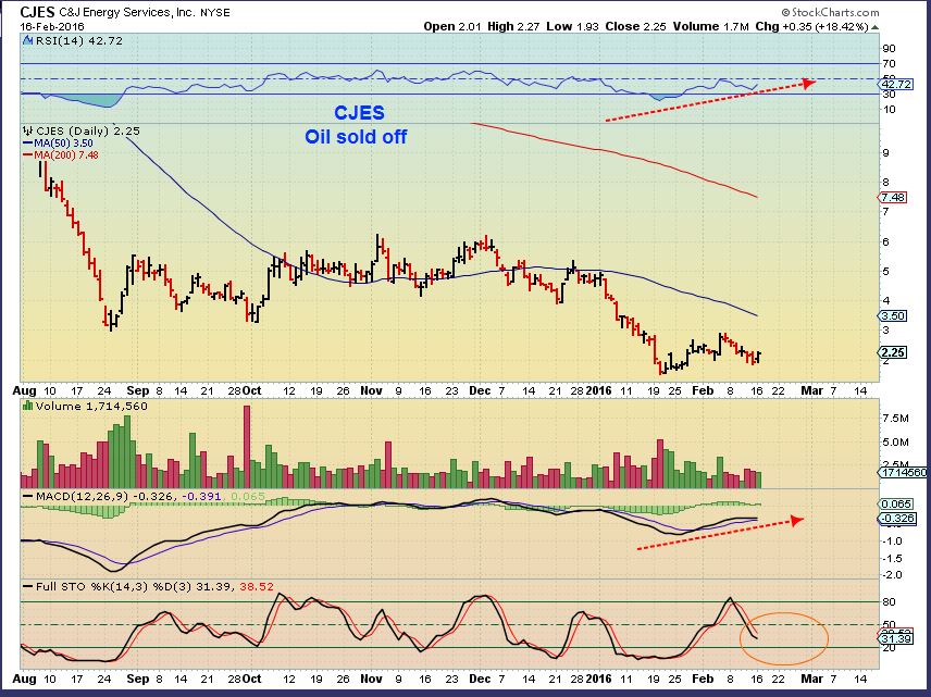 So if you are a trader, you want to check your energy list and see what you can find for higher lows, divergence, etc.  These may have great gains in the longer run too, if they avoid financial problems and Oil has bottomed.   I do want to mention here that until we know whether or not Oil has put in temporary lows or The Lows,  we need to remain defensive.  ALWAYS USE AND HONOR STOPS.  I will occasionally get an email from someone who tells me that they   “…bought  XXXX  at $16 and it is now $6, what should I do now? Add to it? Sell it? “.   That happens when one doesnt use stops.     That is a sad situation, and it is not one that I can answer.  Please trade these with a willingness to sell if they go below your purchase price. I believe that we will have huge opportunities in the future in Miners and Energy,  but you need funds to take advantage of those bigger moves.  Months from now we want to have some good  ‘Gains”,  not be thankful that we are finally back at “break even” .