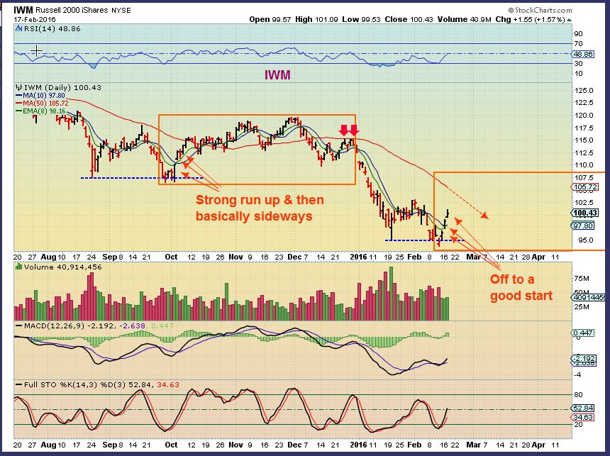 IWM –  In October the IWM shot right up and when it got to the 50sma,, it kind of meandered along. If we start going sideways, there will be signs showing whether it is a consolidation readying to break higher, or drop.
