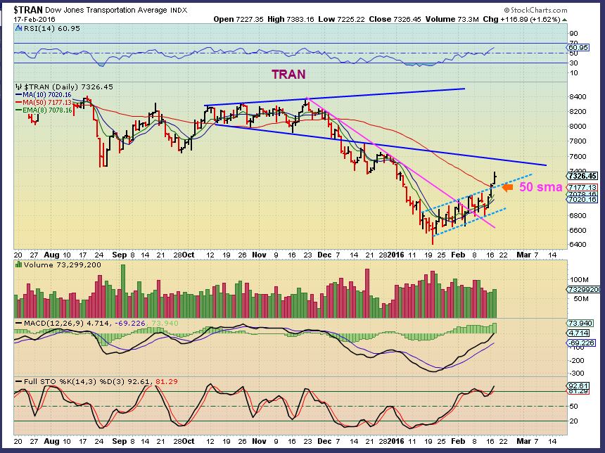 TRAN –   I pointed out yesterday that the TRAN did NOT double bottom like the SPX, QQQ, DJIA, etc.   It seems to be leading  ( it did lead us down too).  Would it stall here at the 50sma?
