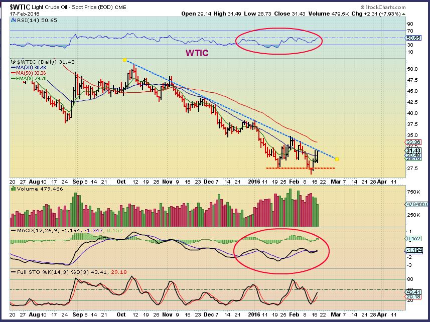 WTIC –  In the last couple of reports I mentioned that the XLE is not breaking down and that I think OIL may be bottoming.  My Nov price target was hit in the low $26 area.   This is a bullish set up the way I look at things.  A move over $33.36 put Oil over the 50sma for the first time since early November.