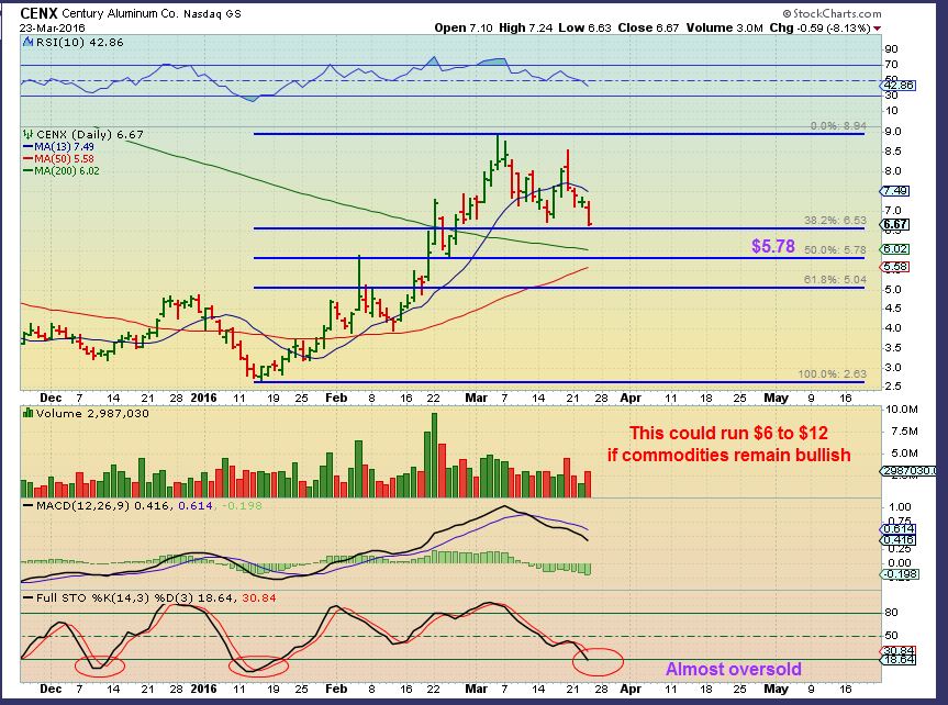 CENX –  Seriously, this was a Great run!  It has been correcting and a drop to the 50 & 200 sma could act as support. You can see how , if commodities have bottomed, this could run another double, triple, or more over time. Lets zoom in.