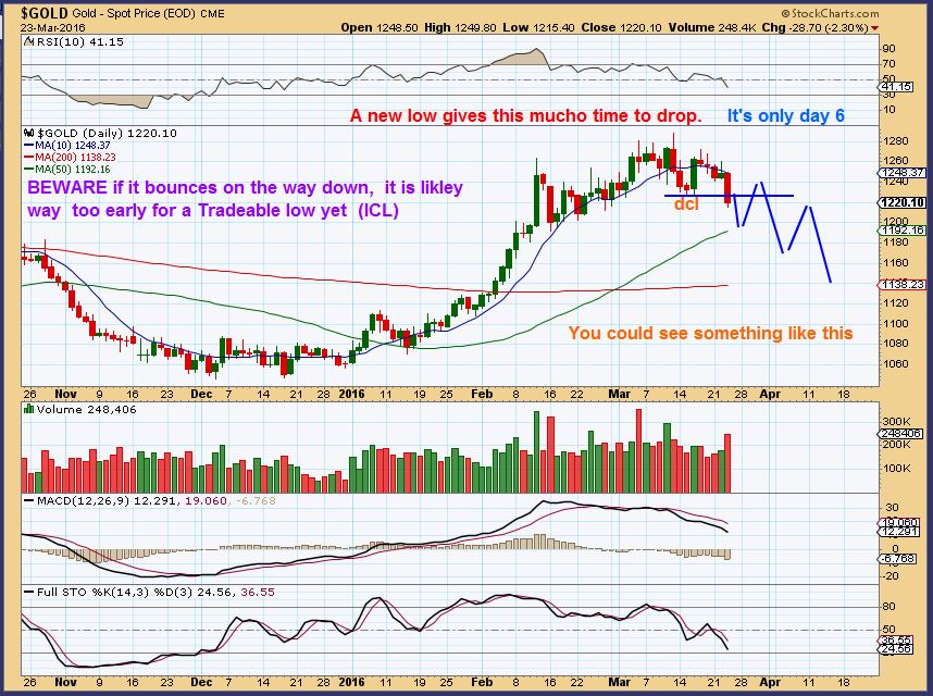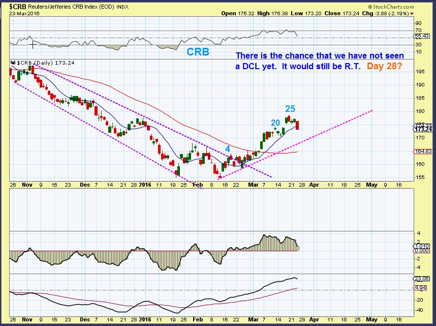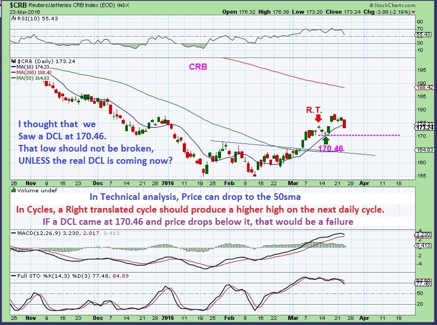 CRB #1 – The CRB looked very bullish to me.  It still does, but using cycles – the picture isnt clear. I thought that day 22 was a DCL  and now we should be moving higher in the 2nd daily cycle  BECAUSE THE FIRST DAILY CYCLE  was very right translated .  That means the high point came late in the cycle (Day 20 high) and the next daily cycle should be strong. Therefore this drop should NOT break the dcl that I thought we formed on day 22.  However, maybe we havent seen the dcl in the CRB yet? See chart.