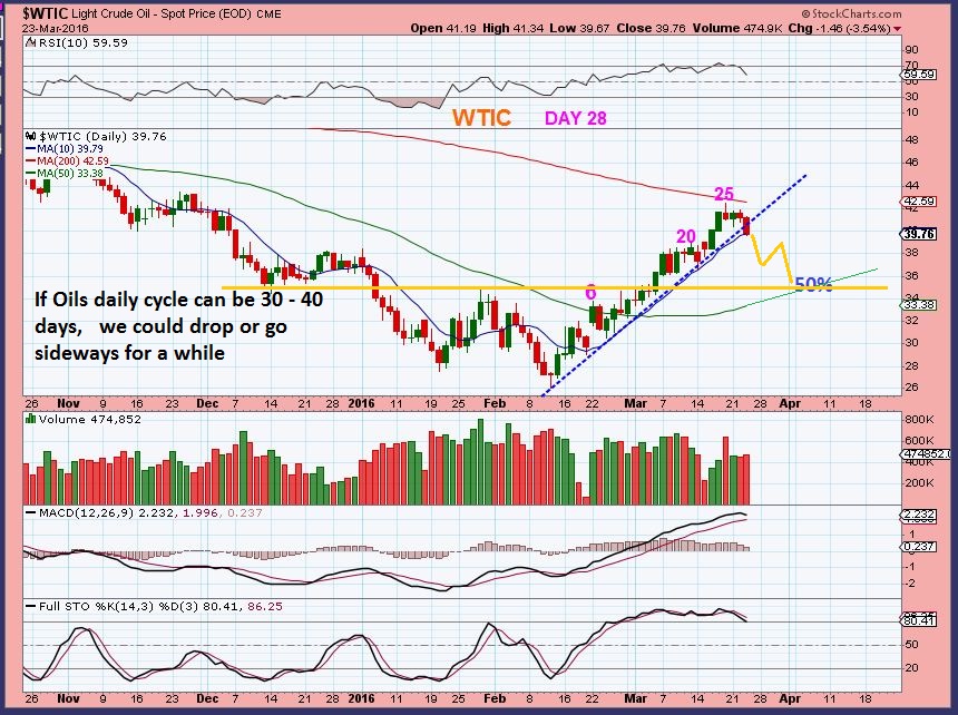 WTIC – We saw a drop in Oil.  As pointed out in 4 oil charts yesterday,  that was not unexpected. Oil was hitting the 200sma, I expect that it may go sideways or drop to build steam to break through it.  On day 28 we MIGHT be dropping to a DCL, since we see a trend line break too, but that drop does not have to be straight down.