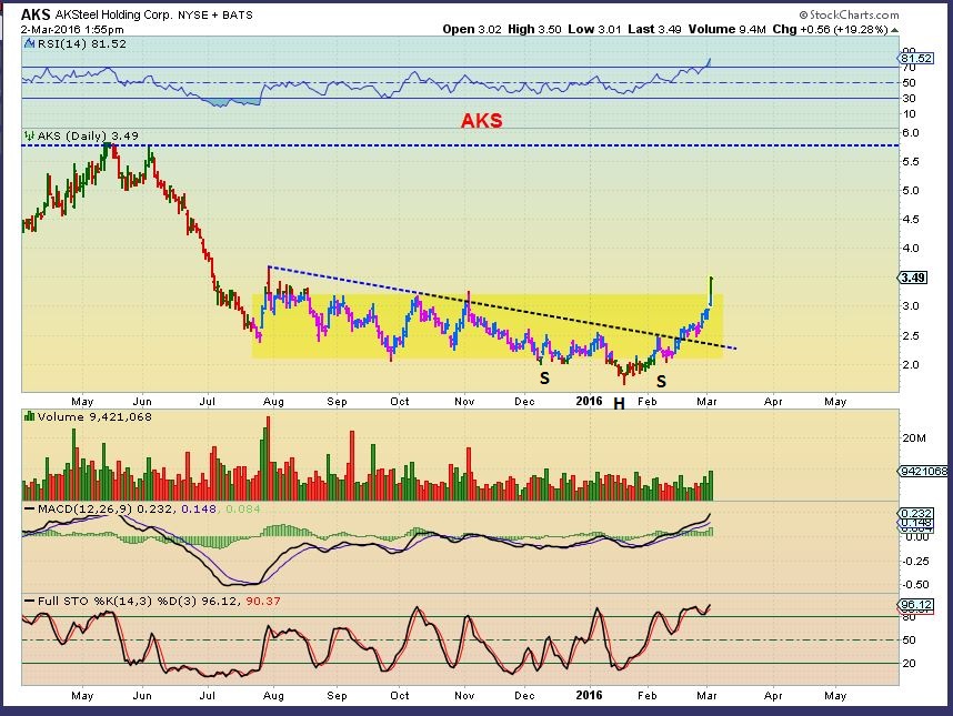 AKS – This is a large base and an inverse H&S breaking out. This reminds me of ABX & NEM.