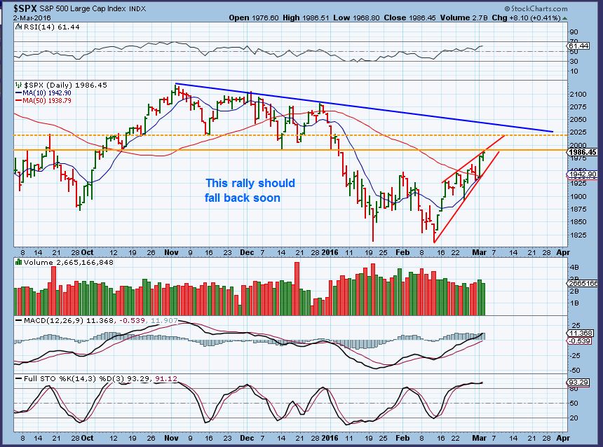 SPX – This does have a bearish rising wedge. I have to expect the markets to drop and we’ll have to see how that drop plays out. If this shoots straight up, it would change into a channel, but that seldom happens. Jobs Report Friday could cause a sell off.