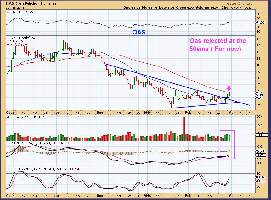 OAS –  Popped but stopped at resistance. This doesn’t look like much, but it was roughly $4 to $6 . It could break out and run nicely if Oil has bottomed.