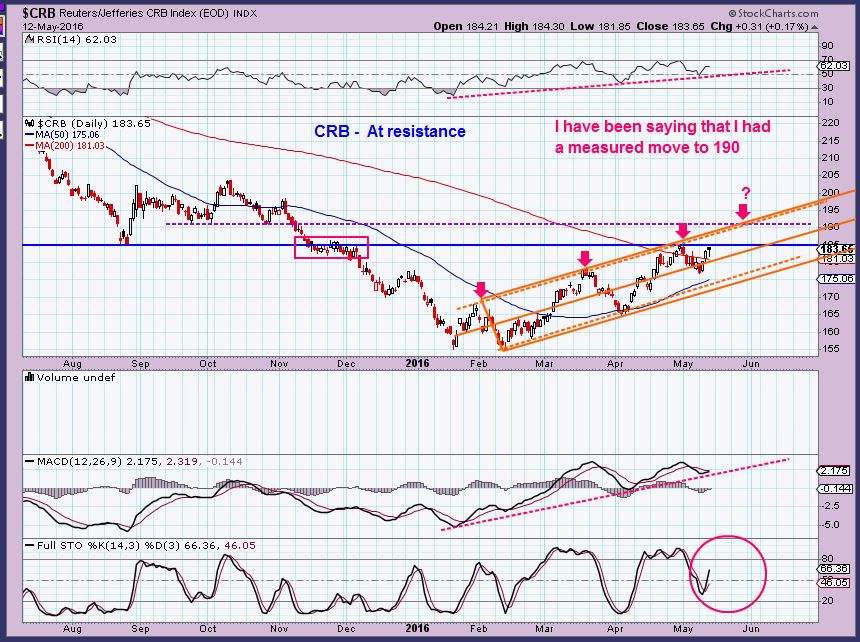 CRB –   CRB 190 still possible as expected for quite a while?   It is possible – but we are still under resistance.  Let me show you something  that does look bullish about the CRB…