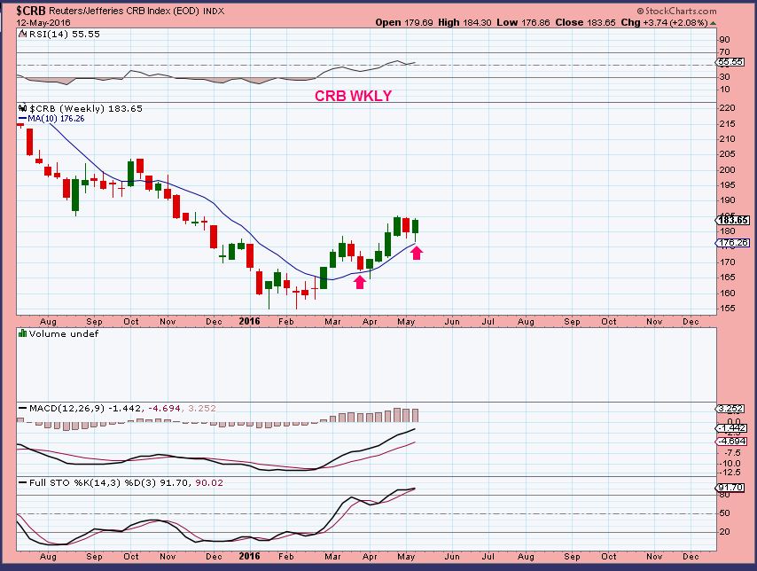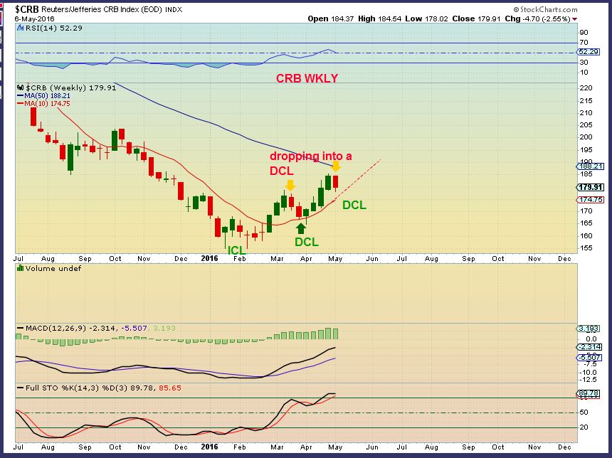 CRB WEEKLY MAY 6th – Last Fridays wkly chart was used in the weekend report.  I pointed out the last drop to an ICL took 2 weeks ( Red candles) in March.   It dropped to the support of the 10MA Wkly, so we could look for that this time.