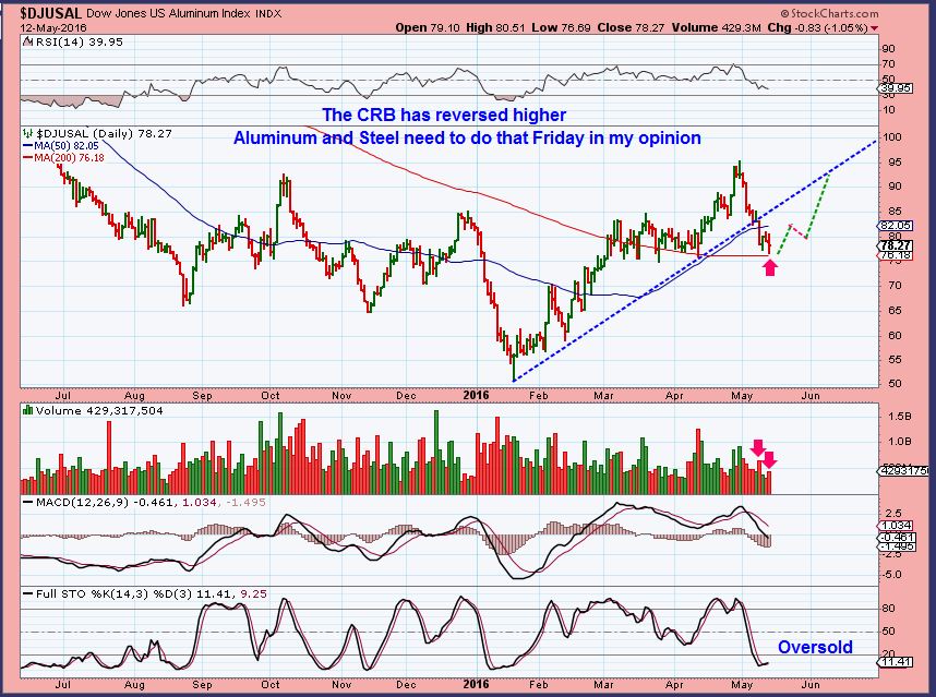 The CRB has reversed and moved higher,  but it is made up of many things.  STEEL, ALUMINUM, and COPPER have not put in a reversal yet.  This affects the stocks Mining those metals.  I would like to see a reversal in these metals  Friday. I expect a bounce in the metals stocks, but that will be a sell in my opinion.