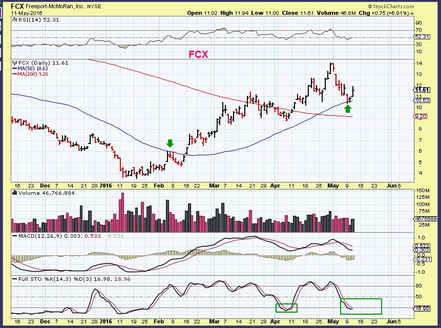 AA – Back inside the March consolidation.  Notice how similar AA looks to the Aluminum chart above .  The selling volume got lighter and both are at the 200sma support.  The charts are practically twins.   I will be watching this area Friday and likely Monday .