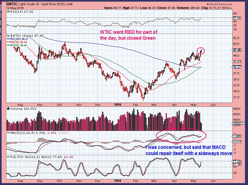 WTIC –  Oil moved higher as expected. This should run to $50 and then we’ll see what happens there. TheMACD divergence with the new highs is improving, but worth keeping an eye on.