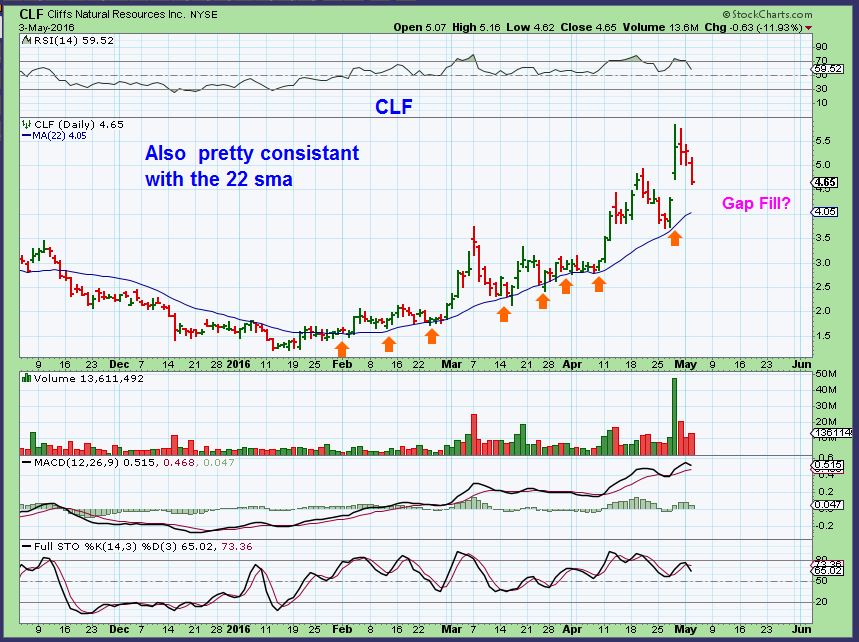 CLF today – The gap did fill and it hit the 22 sma. This is where I would look for a reversal.