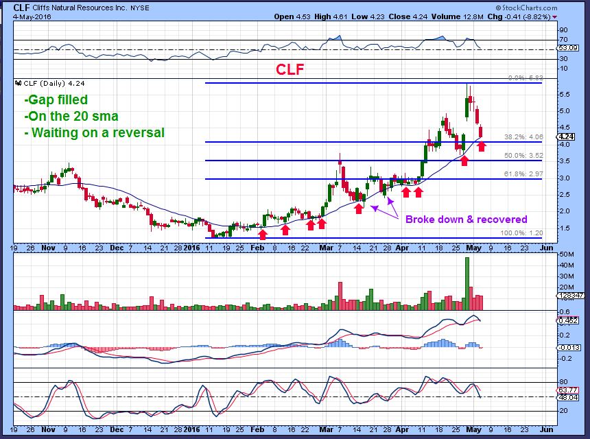 CLF from Wednesdays report– Possible gap fill and drop to the 22 sma?