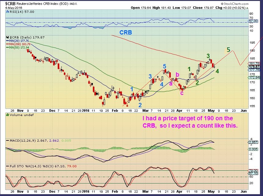 CRB #2 – This slightly different count was what a reader here had, and he has been using E.W. longer than I have, so he very well could be correct. If so, this would indicate that the CRB run is done for now. That MIGHT go along with a dollar rally, CRB drop.