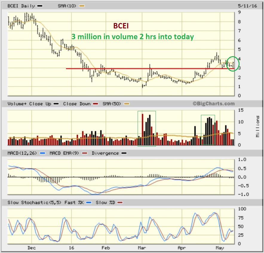 BCEI – I’ve mentioned this one several times due to the strong volume coming out of that base. This chart was captured Wednesday morning for the comments section.  The pullback moved sideways along support and today a burst of volume started coming in…