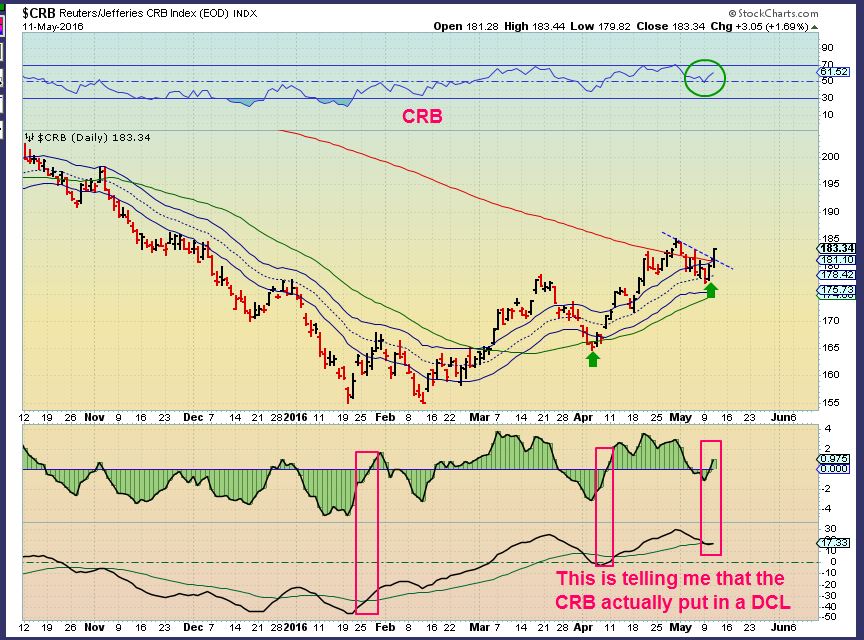 CRB –  Look what the CRB did.  This chart actually is telling me that the CRB has put in a DCL with that recent drop. Granted the CRB didnt drop nearly as fast or deep as many of the commodity stocks, but this is a good sign that those Commodity stocks could be ready to move higher again.