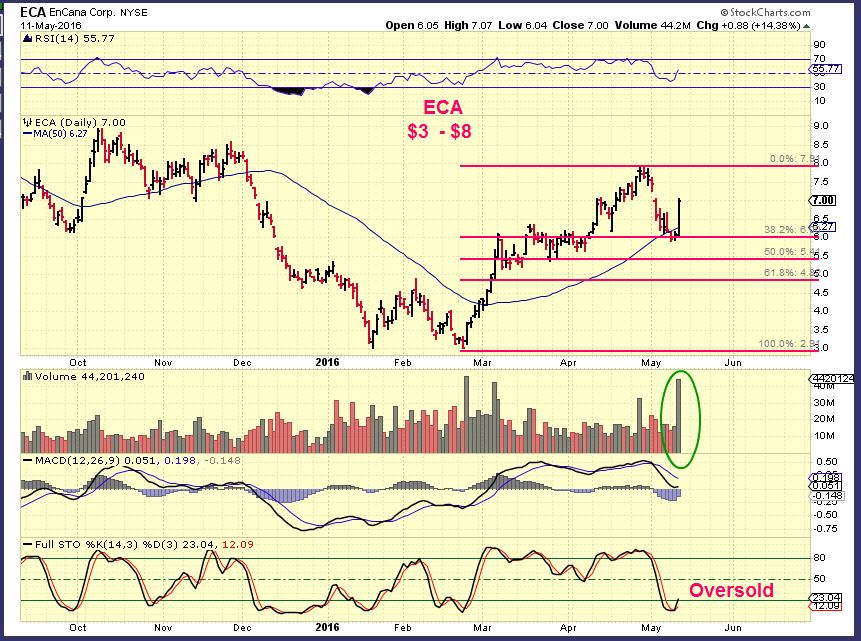 ECA – This stock ran from $3 to $8 and did a 38.2% retrace to the 50sma. Todays reversal was very strong and had strong volume.  It is oversold and may just continue higher, but if it dropped Thursday, you may get a lower entry.  It is hard to buy a stock that was already up 14% in 1 day.