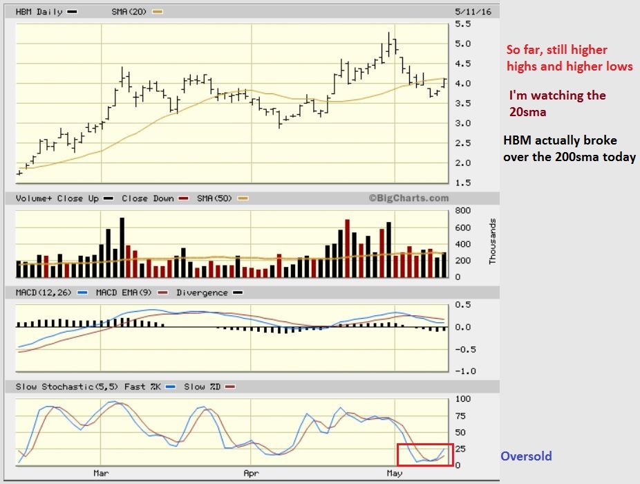 HBM DAILY – If that was a low, it should be able to break above the 20sma . That could be another area to add.  HBM actually closed back above the 200sma  (not shown) .