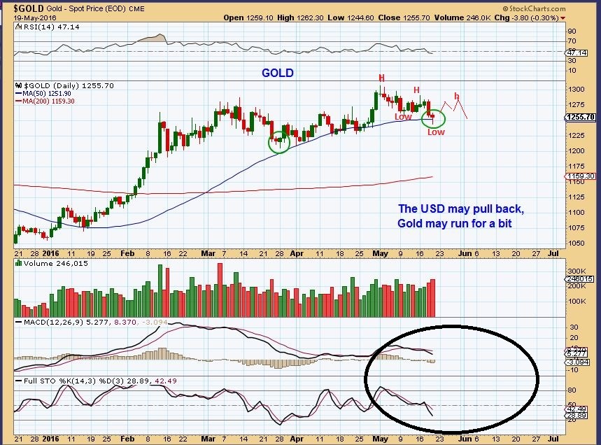 GOLD – Gold reversed at the 50sma.  If the Dollar dips, Gold can rip- BUT HOW STRONGLY?  I have to remain cautious.   I know that this will be tempting, making many think that Gold is taking off again.  The  $USD daily cycle could put in a DCL rather soon.   Gold  could just work sideways like it did at the first green circle, and then still dip down into an ICL. This would make lower highs and lower lows,  as shown.  IF it breaks to new highs,  that Cup & Handle could play out,  and the $USD could roll over.