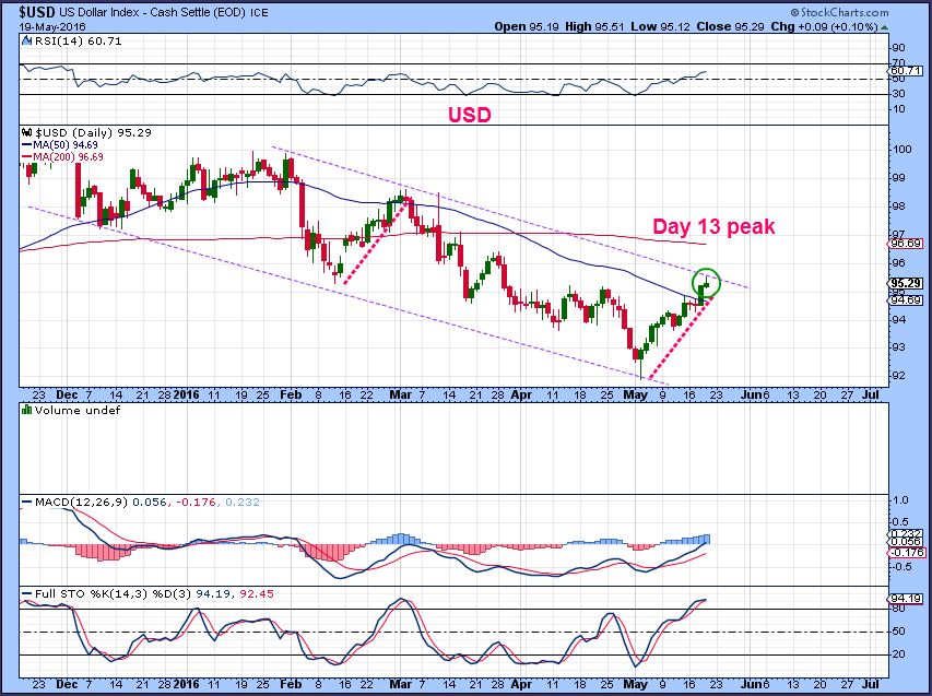 USD – I wanted to point out that the $USD has put in the rally that was expected, and Gold has pulled back.  The USD daily cycles run a bit shorter , so todays reversal candle could signal a daily cycle top.  The dip into a DCL might even push Gold and Miners higher. You’ll see reversals on those charts too.